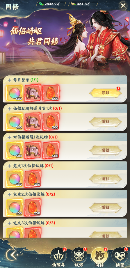 玩家結(jié)婚后,可以開啟同修系統(tǒng),完成同修任務(wù)可以獲得獎(jiǎng)勵(lì)