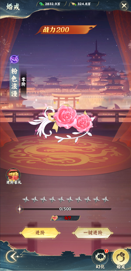 玩家結(jié)婚后開啟,激活婚戒會(huì)獲得戰(zhàn)力提升,消耗婚戒碎片可以進(jìn)行升星,婚戒可以消耗進(jìn)階丹來進(jìn)行升階。