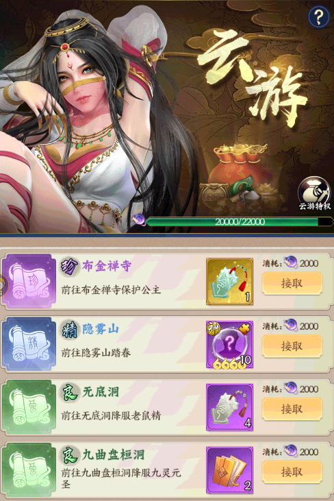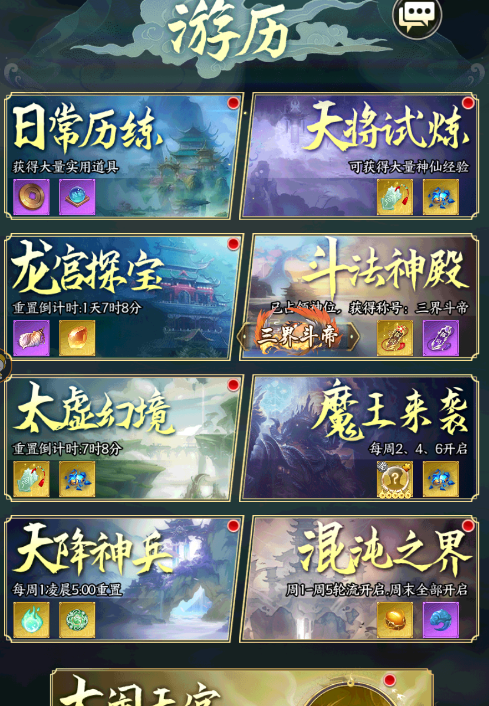 六、參與游歷、仙人渡、萬界天門里的游戲活動(dòng)可以獲得各種稀有道具和積分。建議每天都把這三個(gè)地方,能推進(jìn)的推進(jìn),能打的打,不要留次數(shù),能獲得大量提升用的材料