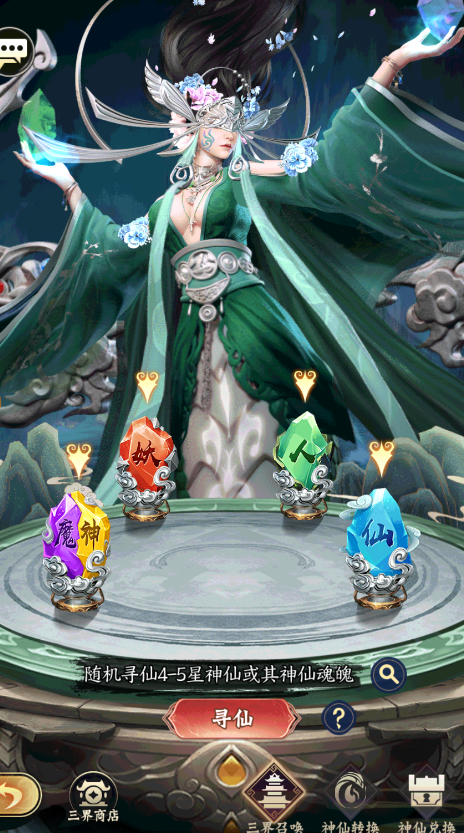 二、獲得神仙的主要途徑是尋仙和三界召喚,尋仙分為天界尋仙、下界尋仙和仙緣尋仙三個(gè)卡池,三個(gè)卡池獲得的神仙品質(zhì)不盡相同,可以消耗仙玉、仙緣點(diǎn)或者尋仙令召喚神仙。三界召喚可以消耗三界召喚令召喚指定種族的神仙,同時(shí)還能通過神仙轉(zhuǎn)換和神仙兌換,獲得想要的神仙