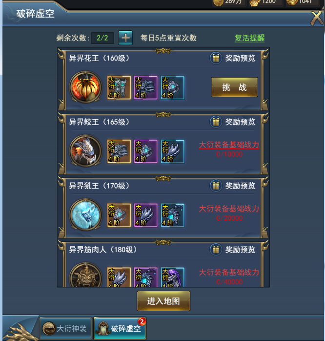 破碎虛空的玩法與“BOSS之家”接近,為一個獨(dú)立的玩法地圖,場景中有多個不同等級的BOSS房間入口。