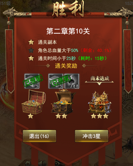 戰(zhàn)斗勝利后將根據(jù)本場的表現(xiàn)決定通關(guān)星級,若達(dá)到三星即可獲得所有獎勵,并解鎖下一關(guān)的挑戰(zhàn)資格。
