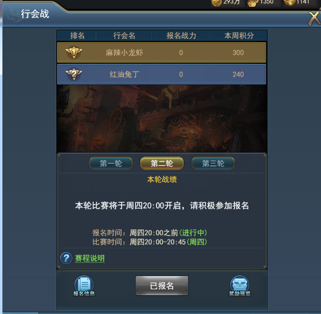 2,所有行會成員均可報名,只要報名就可以在各輪結(jié)束后獲得參與獎。行會報名戰(zhàn)力最高的前10名成員戰(zhàn)力之和,將作為行會的報名戰(zhàn)力