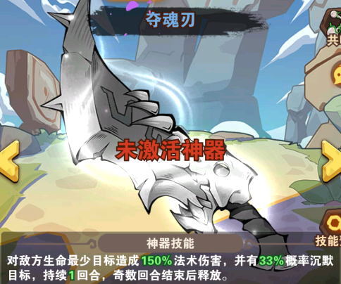 奪魂刃:對(duì)敵方生命最少目標(biāo)造成150%法術(shù)傷害,并有33%概率沉默目標(biāo),持續(xù)1回合,奇數(shù)回合結(jié)束后釋放。