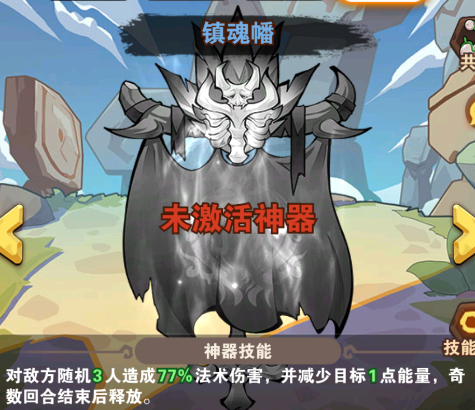 鎮(zhèn)魂幡:對(duì)敵方隨機(jī)3人造成77%法術(shù)傷害,并減少目標(biāo)1點(diǎn)能量奇數(shù)回合結(jié)束后釋放。
