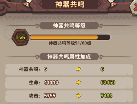 神器可通過(guò)強(qiáng)化提升等級(jí),這邊建議是要平均升每一個(gè)神器的等級(jí),有共鳴等級(jí)屬性加成的,而且也能增加每一個(gè)神器的屬性傷害。