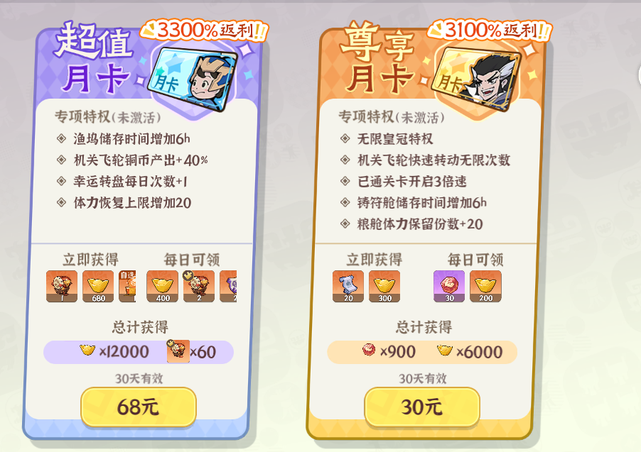 2.月卡&超值月卡:月卡和超值月卡不僅提供每日可領(lǐng)取的元寶和戰(zhàn)船藏品,同時(shí)還能夠加速戰(zhàn)斗和免除廣告;最重要的時(shí),在前期體力溢出時(shí),可以通過(guò)機(jī)關(guān)飛輪快速掃蕩領(lǐng)取大量養(yǎng)成資源,進(jìn)度上快人一步
