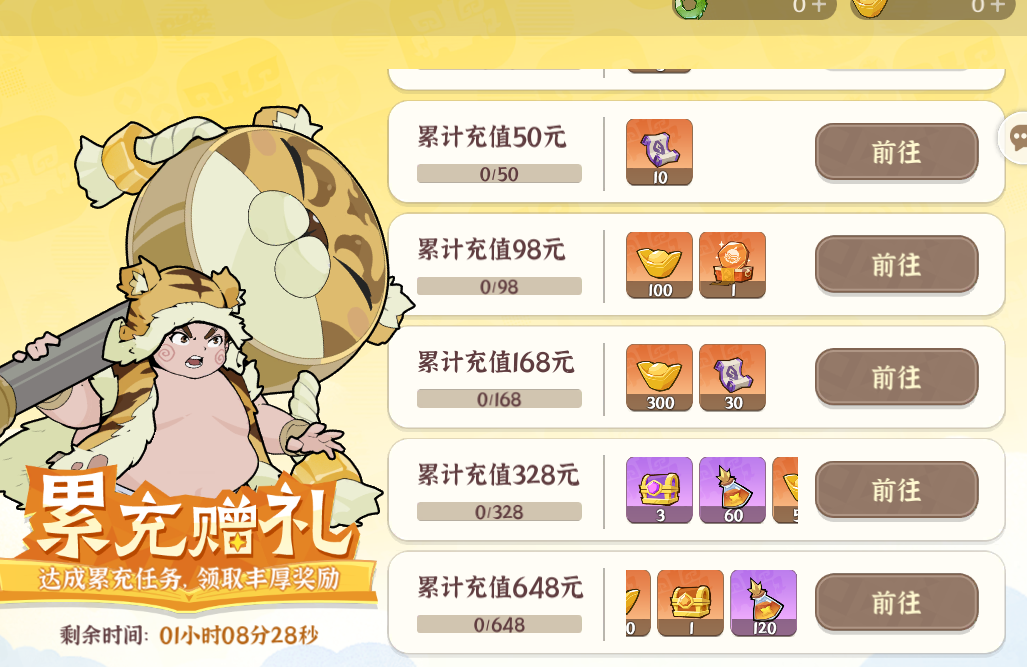 根據(jù)當(dāng)前累充額度距離下一檔累充獎(jiǎng)勵(lì)的差值,可以選擇購(gòu)買(mǎi)一些小額禮包積攢累充進(jìn)度,白拿一檔獎(jiǎng)勵(lì)