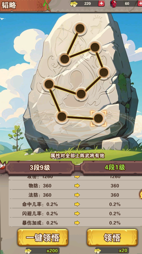 韜略系統(tǒng)比較簡單,一句話來說就是通過家園系統(tǒng)里的烹飪,獲得道具桂花糕,通過使用桂花糕在韜略中領(lǐng)悟,可以解鎖大量屬性加成