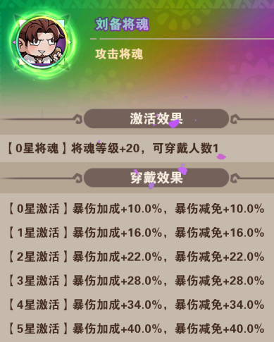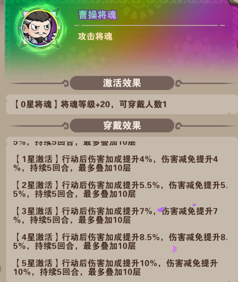 其中幻彩將魂種類多且技能十分強(qiáng)大,如曹操將魂增加傷害加成和傷害減免、劉備將魂增加爆傷加成和爆傷減免等等;當(dāng)然紅色將魂也是十分厲害的,主公可以根據(jù)自己的陣容和英雄進(jìn)行不同的搭配哦