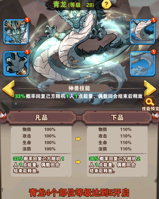 每種神獸都有他的技能,分別對應(yīng)著青龍—回能、白虎—加攻、朱雀—回血、玄武—加防,由于布陣只能上一個(gè)神獸,這邊建議優(yōu)先升級(jí)青龍或者白虎