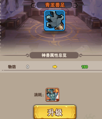 神獸升階需要消耗大量神獸碎片,如凡品青龍升到下品青龍需要四個(gè)部位均達(dá)到5級(jí),而每次升級(jí)需要10個(gè)青龍碎片