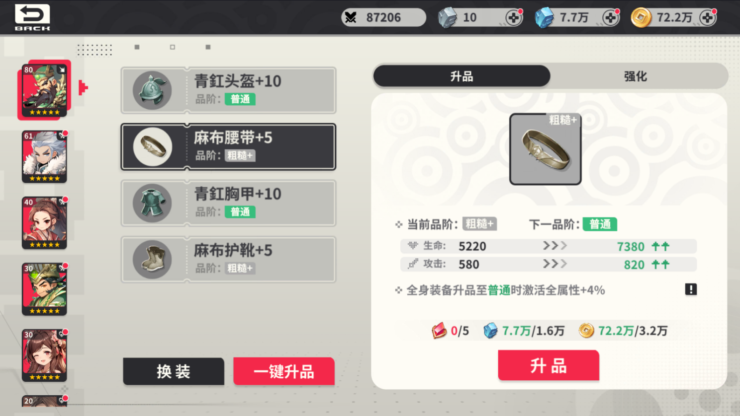 玩家可以通過掛機(jī)、古城商店購買等方式獲得裝備,裝備可以進(jìn)行強(qiáng)化,提升屬性。同時(shí),湊齊同品質(zhì)的裝備還可以觸發(fā)套裝效果