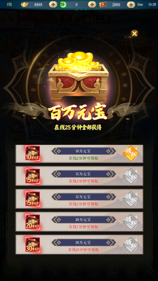 進入游戲后完成在線時長即可領取百萬元寶,無門檻開啟的