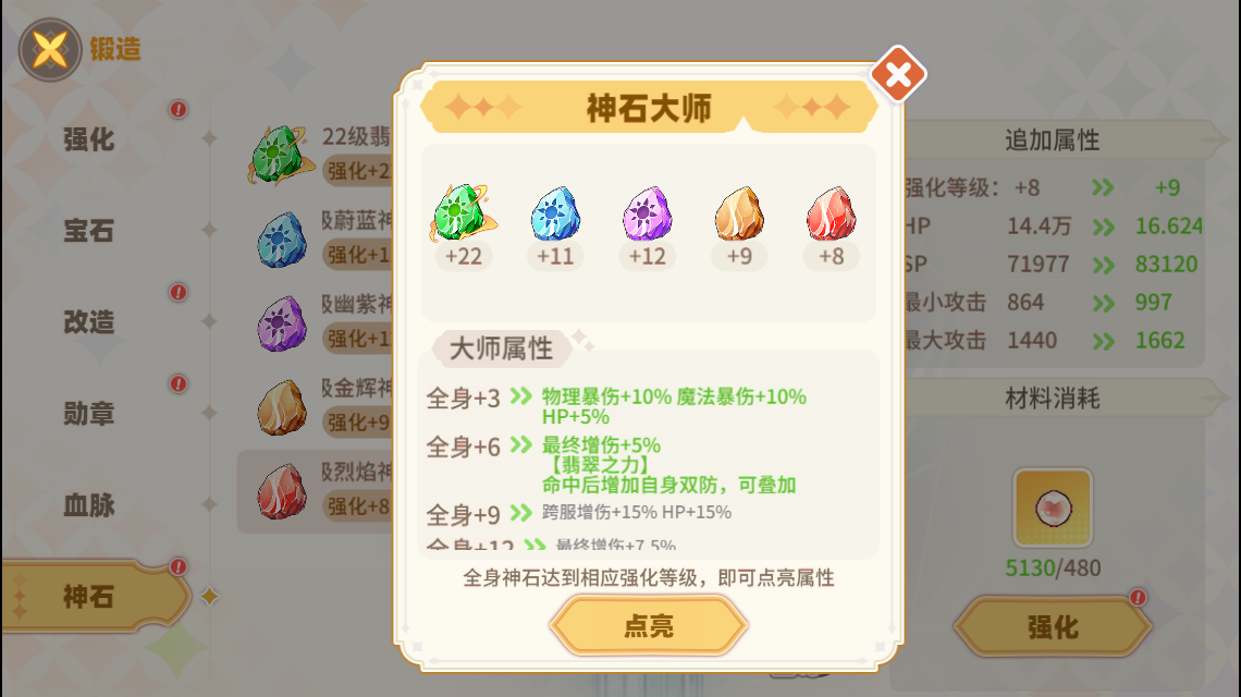 神石有5種類型,玩家可在神石寂寞查看神石屬性,消耗對應材料可對神石進行升級。