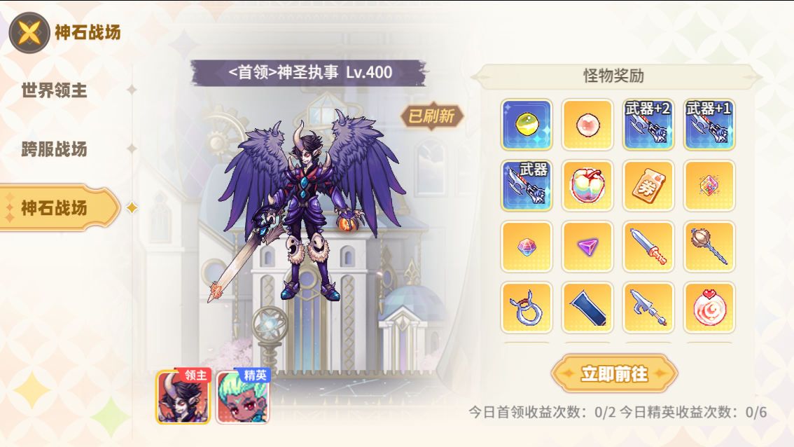 挑戰(zhàn)神石戰(zhàn)場的首領(lǐng)和精英可獲得對應獎勵,首領(lǐng):傷害排名最高的個人或隊伍可獲得神石首領(lǐng)獎勵;精英:最后擊殺者可獲得精英獎勵。玩家每日可挑戰(zhàn)神圣戰(zhàn)場次數(shù)有限,超過次數(shù)將無法造成傷害無法獲得獎勵。