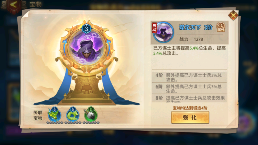 2,每一組寶物湊齊可以激活技能,技能可以給少主的武將,謀士提升很高的屬性。