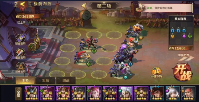 第三關(guān)敵方陣容比較單一己方也不要選什么花里胡哨的,分配戰(zhàn)力、上陣傳統(tǒng)陣容即可,要注意的是面對敵方多輕騎陣容時,要保護(hù)好己方輸出主將,保證雙C安全,陣容才能夠穩(wěn)定。